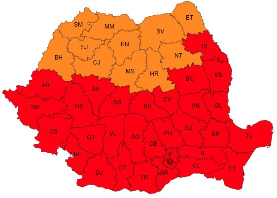 Administrația Națională de Meteorologie a transmis un cod galben de vijelii și averse torențiale, valabil până la ora 02:00 a nopții de miercuri spre joi, dar și o serie de coduri de caniculă care va afecta miercuri toată România și joi aproximativ jumătate de țară.