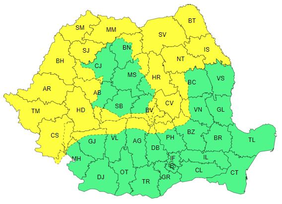 De miercuri ora 12:00, până joi, ora 02:00, în zona de munte, în Banat, Crișana, Maramureș și jumătatea de nord a Moldovei vor fi perioade cu instabilitate atmosferică. Aceasta se va manifesta prin intensificări ale vântului și vijelii (rafale în general de 55…70 km/h), grindină, descărcări electrice și averse torențiale. În intervale scurte de timp sau prin acumulare cantitățile de apă vor fi de 20…25 l/mp și izolat de peste 40…50 l/mp.