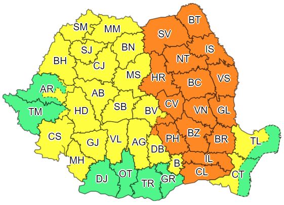 Administrația Națională de Meteorologie a emis coduri portocalii sau galbene de instabilitate atmosferică pentru cea mai mare a părții, avertizările fiind valabile până miercuri noapte.