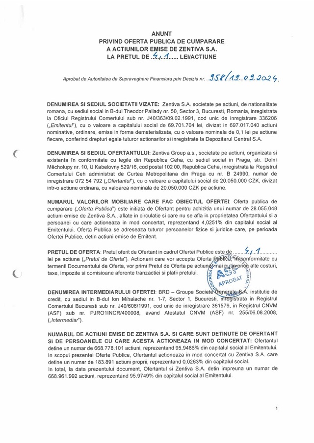 Anunţ privind oferta publică de cumpărare a acţiunilor emise de Zentiva SA la preţul de 4,1 lei/acţiune