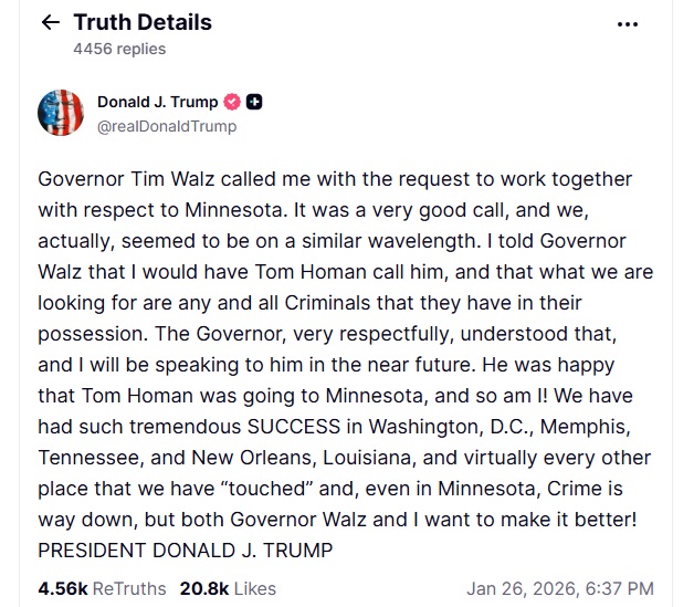 Președintele Donald Trump a anunțat luni că a avut o discuție telefonică „foarte bună” cu Tim Walz, guvernatorul statului Minnesota, și că cei doi doresc să colaboreze pentru a îmbunătăți situația din Minnesota, unde agenții americani ai poliției imigrării (ICE) ucis doi cetățeni americani în această lună, scriu Reuters, CNN și The Guardian.