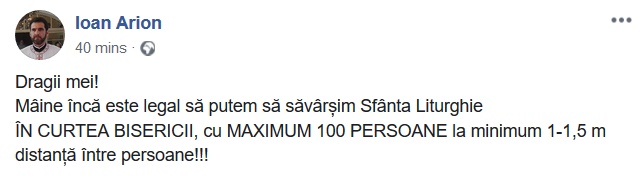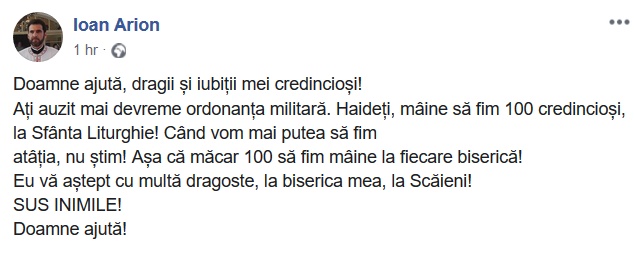 „Doamne ajută, dragii și iubiții mei credincioși! Ați auzit mai devreme ordonanța militară. Haideți, mâine să fim 100 credincioși, la Sfânta Liturghie! Când vom mai putea să fim atâția, nu știm! Așa că măcar 100 să fim mâine la fiecare biserică! Eu vă aștept cu multă dragoste, la biserica mea, la Scăieni! SUS INIMILE! Doamne ajută!”, este mesajul postat pe Facebook de preotul Ioan Arion.