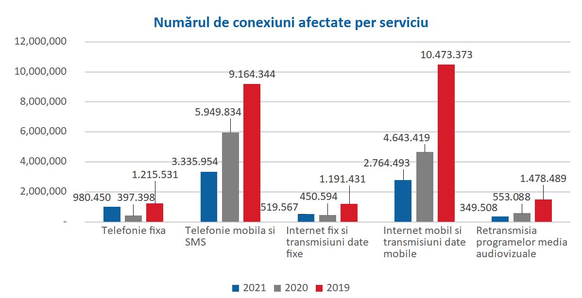 Numărul mediu de conexiuni afectate de un incident în 2021 este de 18.577, în scădere față de 20.582 conexiuni în anul 2020. Defalcat pe servicii însă, situația indică o creștere a numărului mediu de conexiuni afectate în cazul serviciilor de telefonie fixă şi în cazul serviciilor de internet fix și o scădere în cazul serviciilor mobile şi a serviciilor de retransmisie a programelor media audiovizuale.
