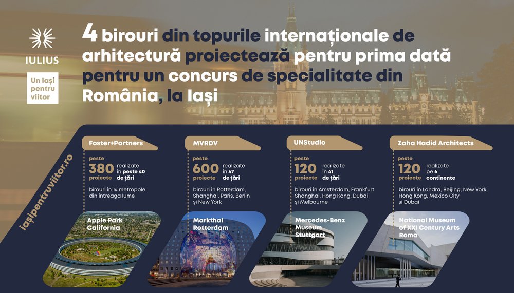 Foster&Partners, MVRDV, UNStudio și Zaha Hadid Architects, unele dintre cele mai renumite birouri de arhitectură din lume, proiectează pentru prima dată în cadrul unui concurs internațional de arhitectură din România, organizat la Iași, la inițiativa grupului IULIUS.