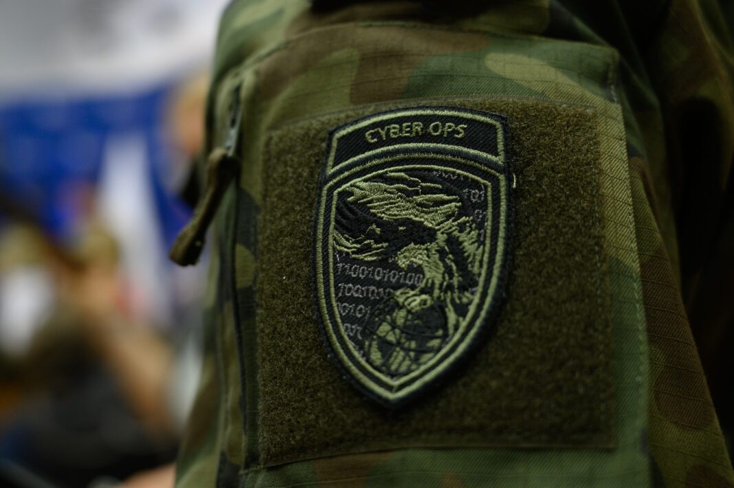 Insignă a Forțelor Armate Poloneze pentru Spațiul Cibernetic, văzută în timpul unei conferințe de presă la Statul Major General al Armatei Poloneze din Varșovia, Polonia, pe 6 noiembrie 2025.