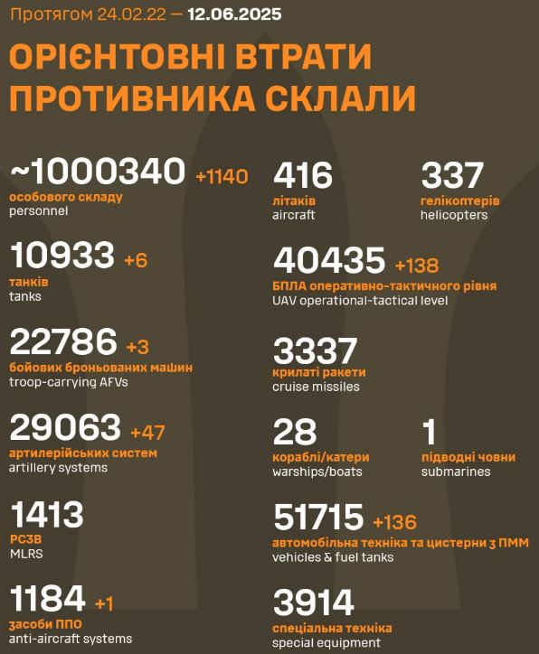 Armata rusă a pierdut un milion de militari de când Vladimir Putin a decis să trimită 200.000 de soldați în Ucraina, în februarie 2022, potrivit ultimei estimări a statului major ucrainean, care a transmis joi dimineață că totalul a ajuns la 1.000.340 după ce inamicul a pierdut încă 1.140 de oameni în ultimele 24 de ore.