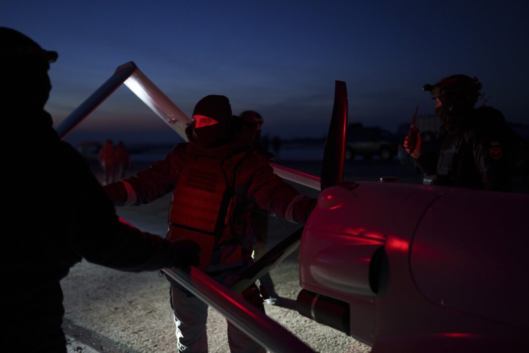 Militari ucraineni din cadrul Serviciului de informații al apărării se pregătesc să lanseze o dronă cu rază lungă de acțiune An-196 Liutyi, într-o locație nedezvăluită din Ucraina, pe 28 februarie 2025.