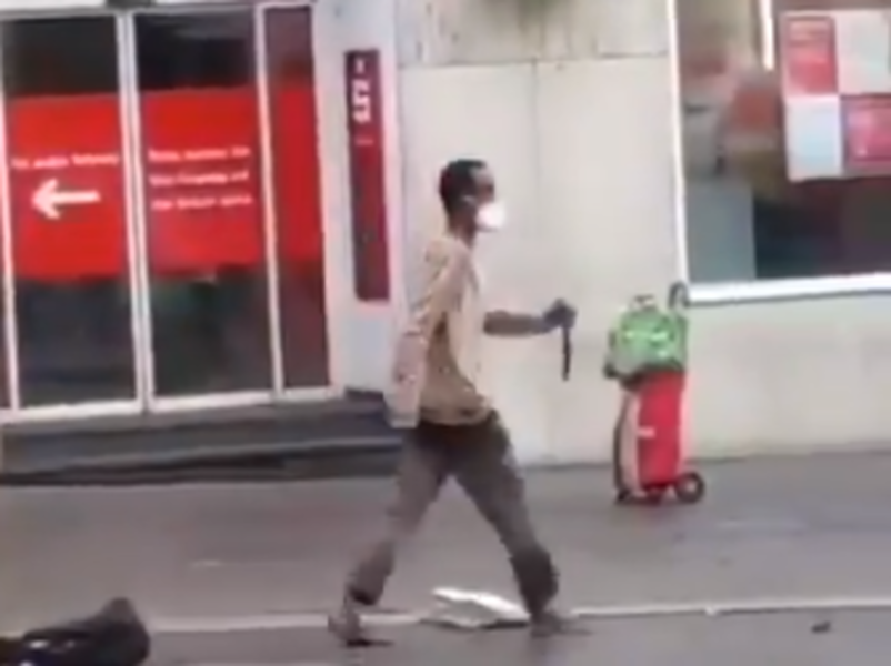 Imagini video postate pe rețelele de socializare arată un tânăr care pare să țină un cuțit în mână este ținut la distanță de alți bărbați.