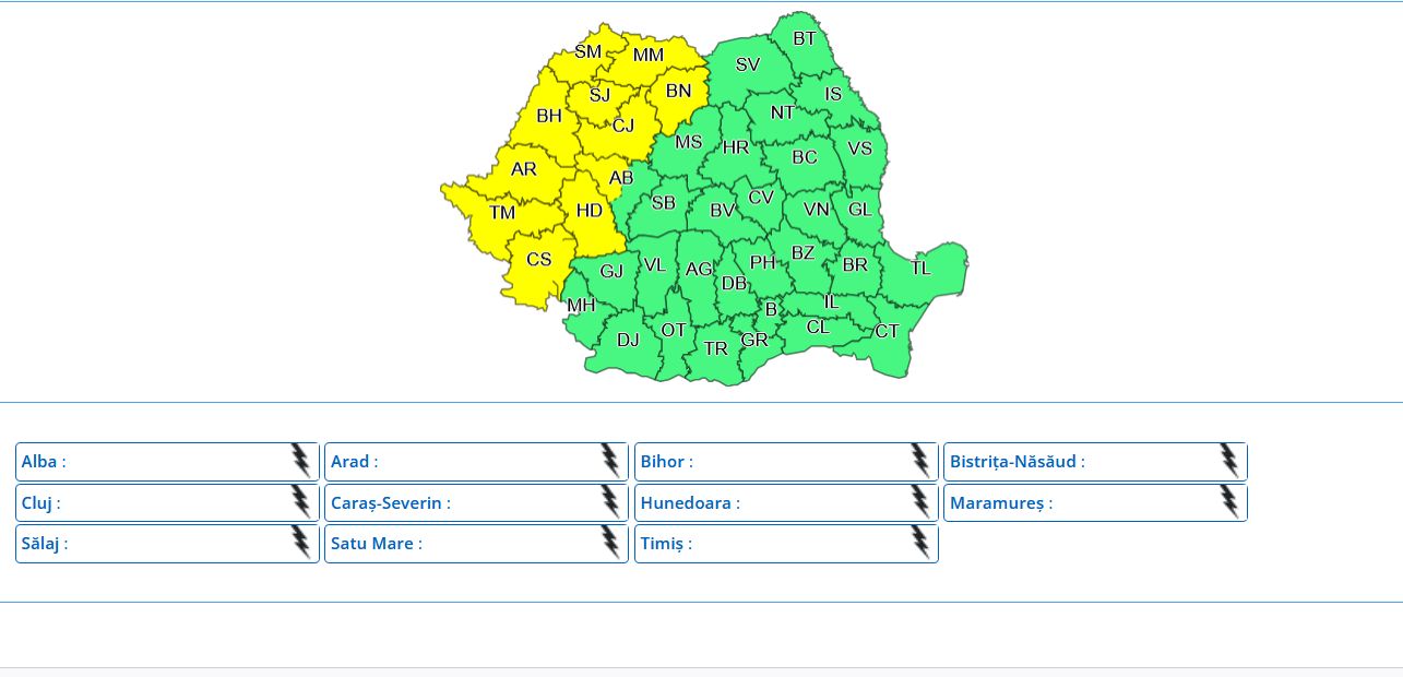 ANM a emis o atenționare de vreme rea pentru un sfert dintre judetele țării, atenționare valabilă între joi (ora 13) și vineri (ora 10). Vor fi averse, uneori cu caracter torențial, descărcări electrice și intensificări de scurtă durată ale vântului