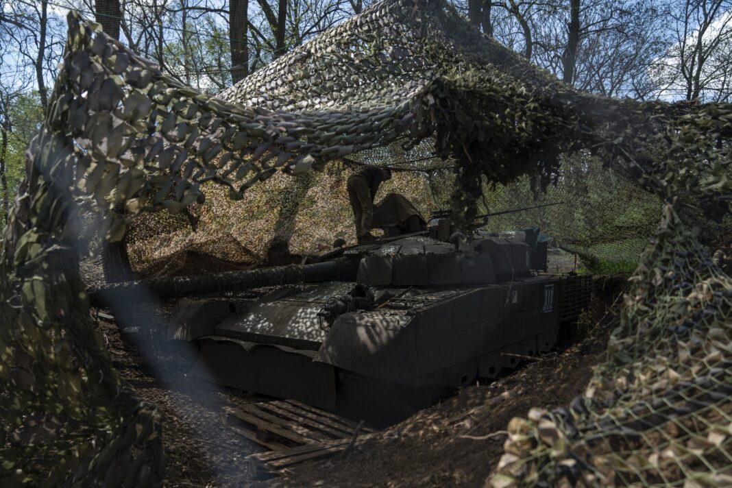 Tanchiști ucraineni repară un tanc T80 capturat în luptele dintre armata ucraineană și soldații ruși în raionul Kostiantynivka, din Donețk, Ucraina, pe 27 aprilie 2025.