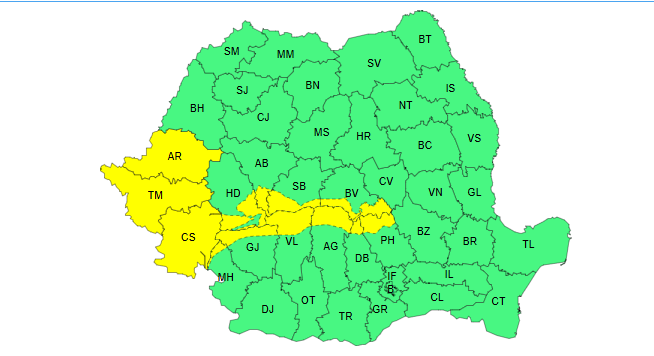 Județele Arad, Timiș și Caraș-Severin se vor afla în totalitate sub atenționarea meteorologilor, iar parțial județele: Hunedoara, Mehedinți, Alba, Gorj, Sibiu, Vâlcea, Brașov, Argeș, Dâmbovița și Prahova.
