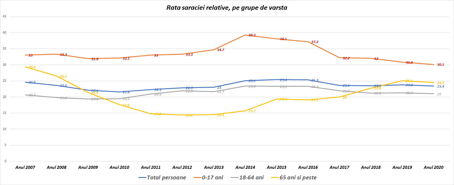 Tot la capitolul bunăstare, menționăm și rata sărăciei relative, care a scăzut aproape la toate grupele de vârstă, înregistrând însă o creștere ușoară pentru cei din grupa 18-64 de ani: