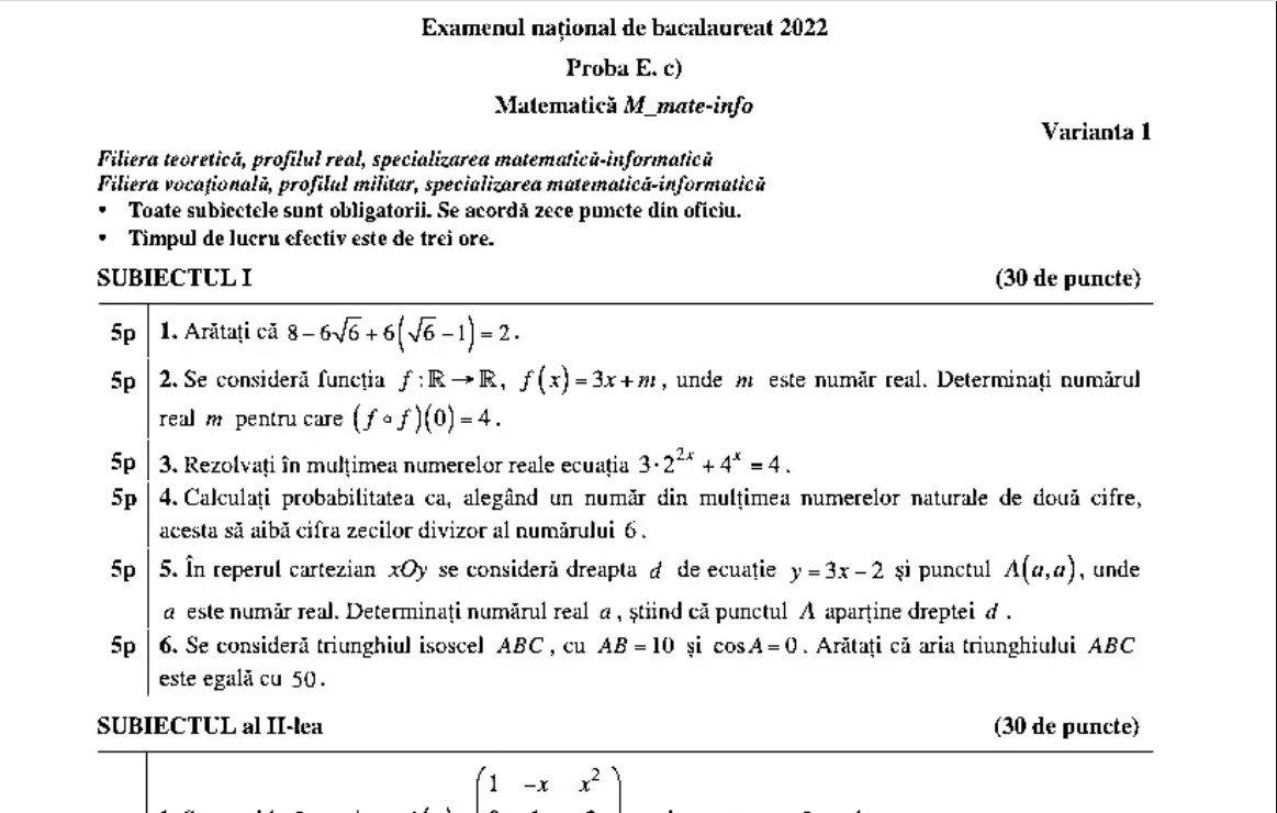 Iată mai jos subiectele la matematică la BAC 2022 primite de absolvenții profilului real – mate-info la bacalaureat, sursa edupedu.ro