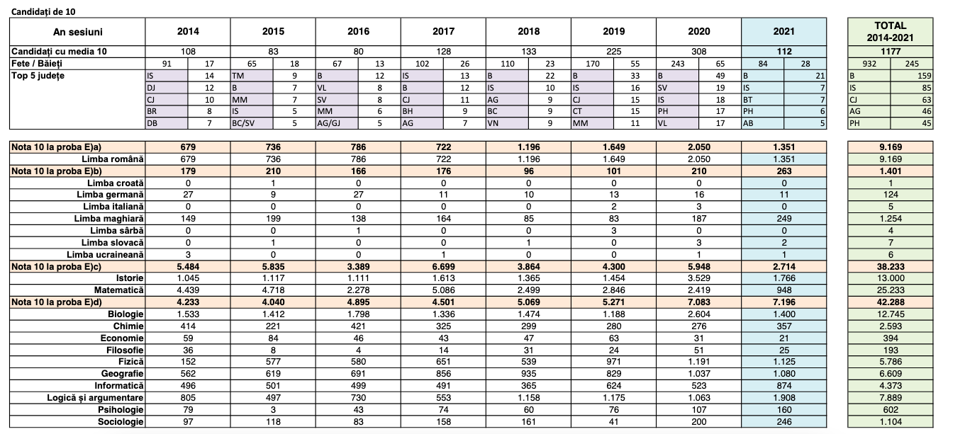 Pe discipline de examen, situația candidaților cu note de 10 este următoarea: