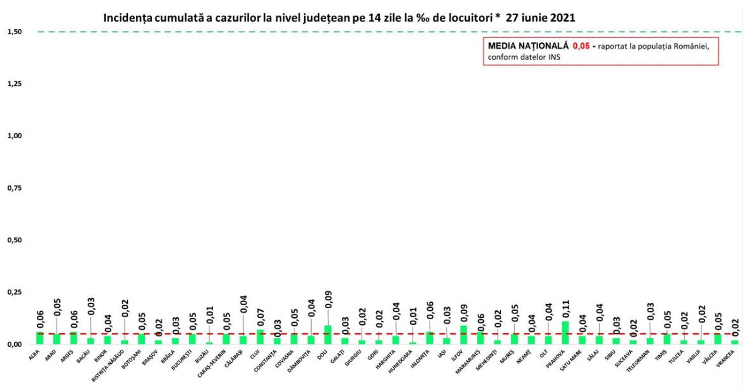 În intervalul 26.06.2021 (10:00) – 27.06.2021 (10:00) au fost raportate de către INSP 76 de decese (48 bărbați și 28 femei), ale unor pacienți infectați cu noul coronavirus, internați în spitalele din Botoșani, Maramureș, Mureș, Prahova și Municipiul București.