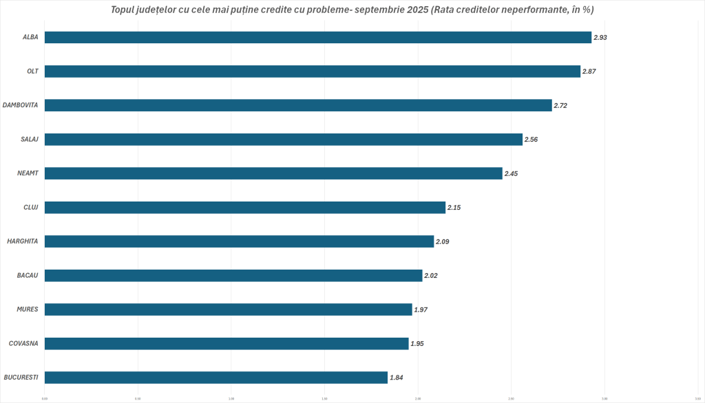 Potrivit unui document al BNR consultat de HotNews, București, Covasna și Mureș sunt județele cu o rată a neperformantelor de sub 2%.