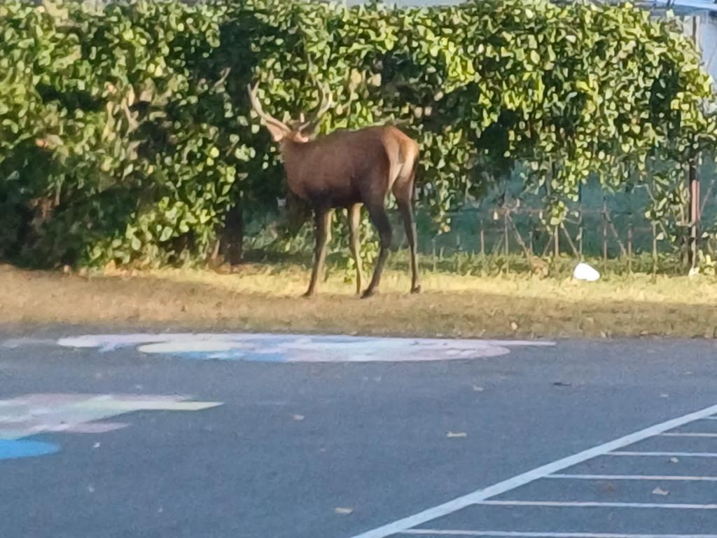 Imagini cu un cerb care şi-a făcut apariţia, joi dimineaţă, în curtea Şcolii Gimnaziale Nr. 3 din Râşnov au fost postate pe reţelele de socializare.