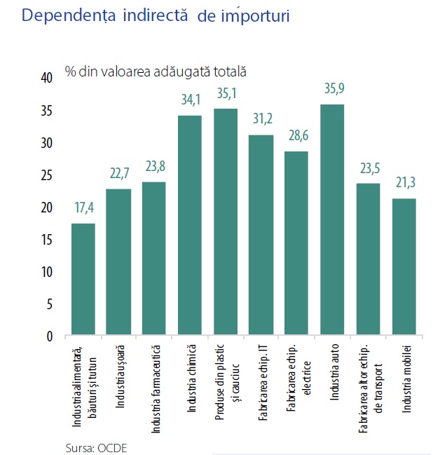 Dependența indirectă variază între circa 17% pentru alimente și peste 35% pentru automobile sau produse din plastic și cauciuc