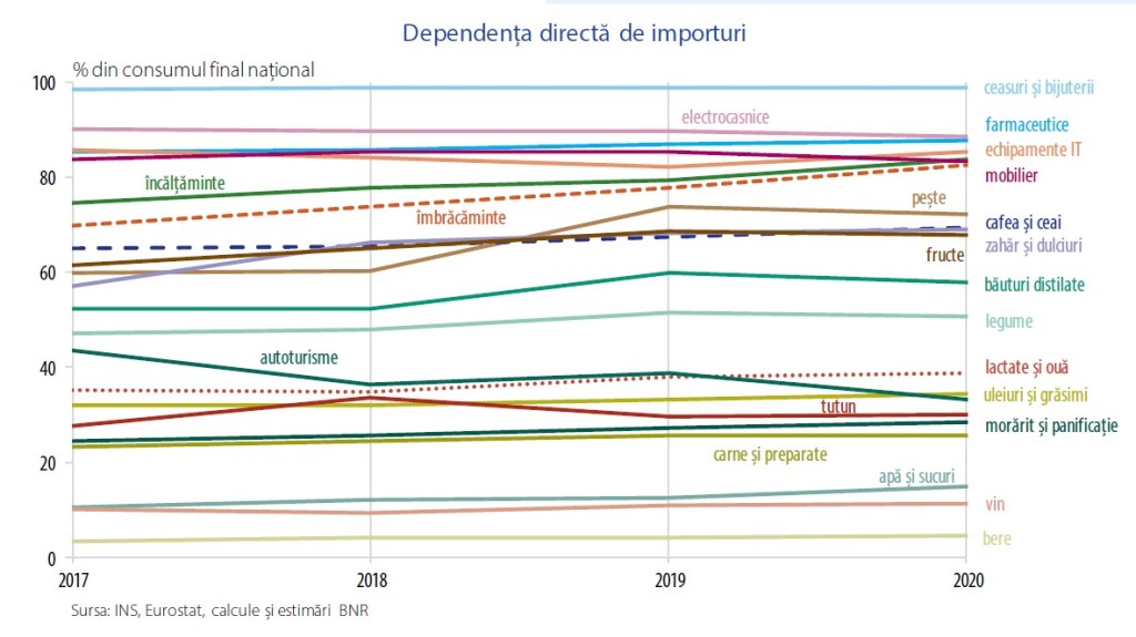 Consumul pe import variază între mai puțin de 10% pentru băuturile alcoolice ușoare și până la aproape 100% în cazul unor bunuri personale. Inclusiv în cadrul grupei bunurilor alimentare, consumul produselor din carne afișează un conținut direct de import de aproximativ 25%, în timp ce în cazul peștelui, contribuția externă se apropie de 75%. Pe ansamblul grupei bunurilor alimentare, se observă o ușoară tendință de creștere a dependenței directe în intervalul analizat, de la aproape 28% în 2017, până la 31% în 2020.