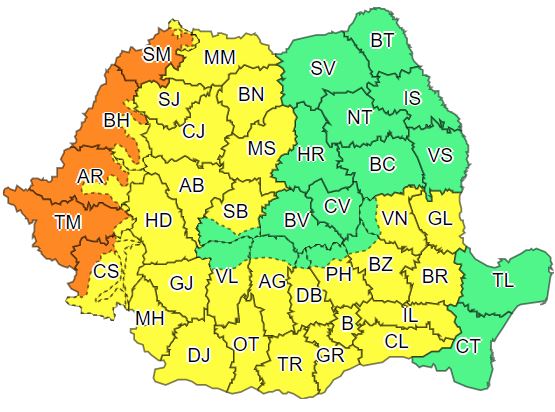 Codul portocaliu avertizează că, în județele Satu Mare, Bihor, Arad, Timiș și Caraș-Severin, disconfortul termic va fi accentuat și va fi caniculă.
