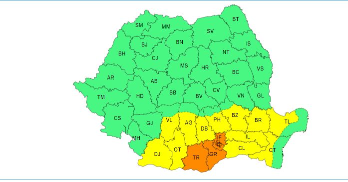 O atenționare cod portocaliu a fost emisă joi, 22 august, pentru municipiul București și județele Argeș, Dâmbovița, Prahova, Ilfov, Teleorman, Giurgiu, Ialomița, Călărași și Constanța.