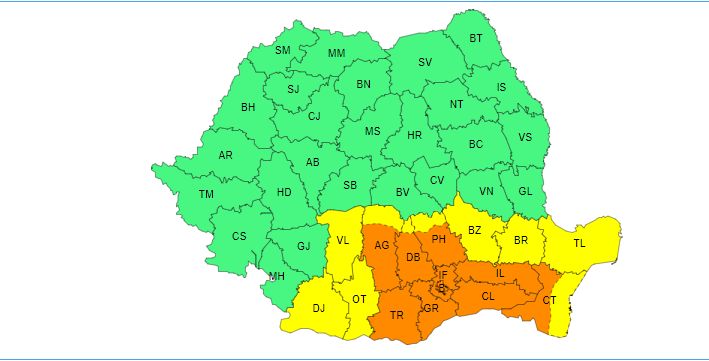 De asemenea, un cod galben este valabil pentru sudul și estul Olteniei, nordul Munteniei și cea mai mare parte a Dobrogei. Aici, temperaturile maxime se vor situa în general între 33 și 35 de grade.
