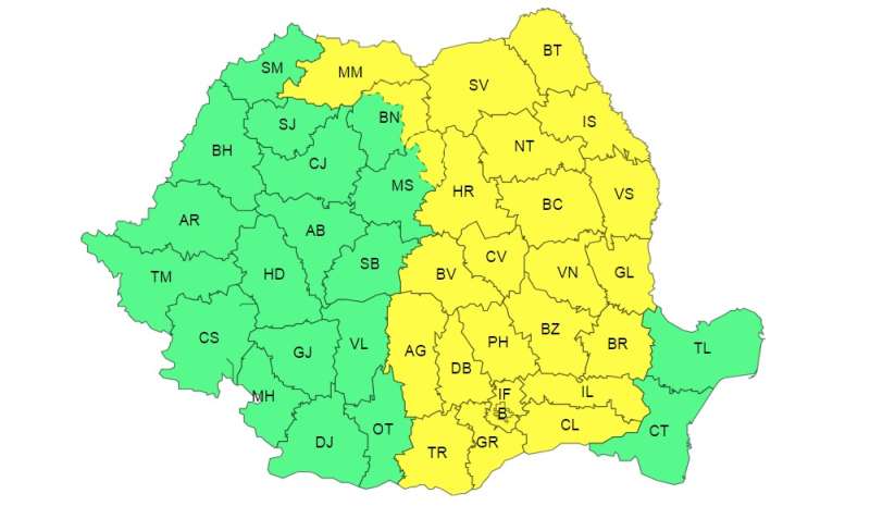 Atenţionarea Cod galben vizează Capitala şi judeţele Argeş, Bacău, Bistriţa-Năsăud, Brăila, Botoşani, Braşov, Buzău, Călăraşi, Covasna, Dâmboviţa, Galaţi, Giurgiu, Harghita, Ilfov, Ialomiţa, Iaşi, Maramureş, Mureş, Neamţ, Prahova, Suceava, Teleorman, Vrancea şi Vaslui.