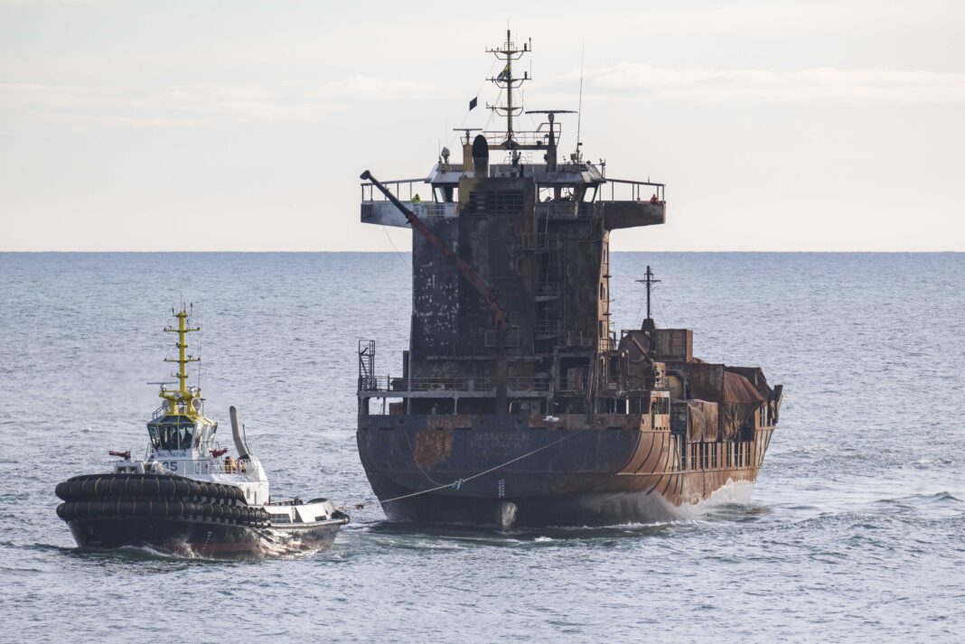 Nava „Solong”, tractată în port de Paza de Coastă britanică după coliziunea cu petrolierul american, FOTO: Michal Wachucik / PA Images / Profimedia