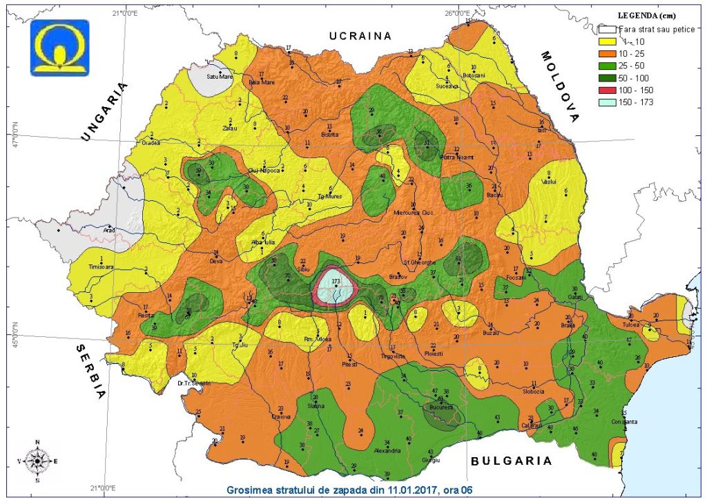 În 2019 a fost strat de zăpadă de 229 cm la stația meteo montană Cuntu, în munții Țarcu din vestul țării, la peste 1.400 m alt.