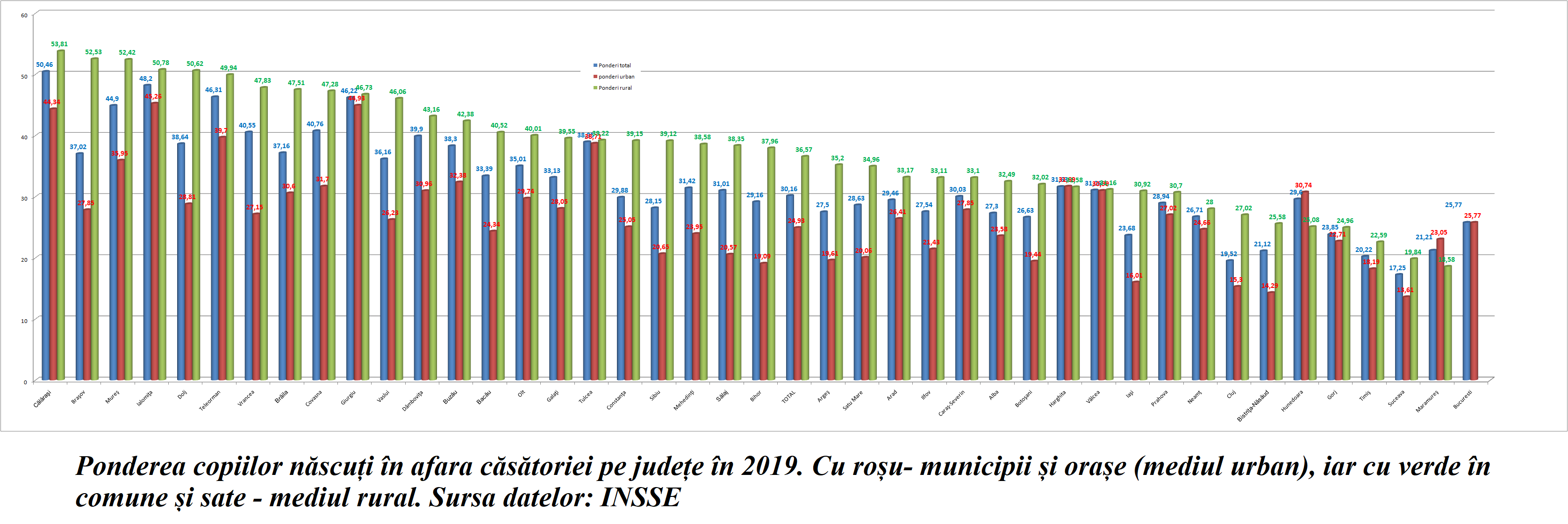 În zonele urbane din Ialomița, Giurgiu și Călărași și Teleorman sunt cei mai mulți copii născuți înafara căsătoriei. În spațiul rural, Călăraşi, Braşov, Mureş și Ialomiţa sunt județele ”campioane” la numărul de copii născuți înafara căsătoriei.