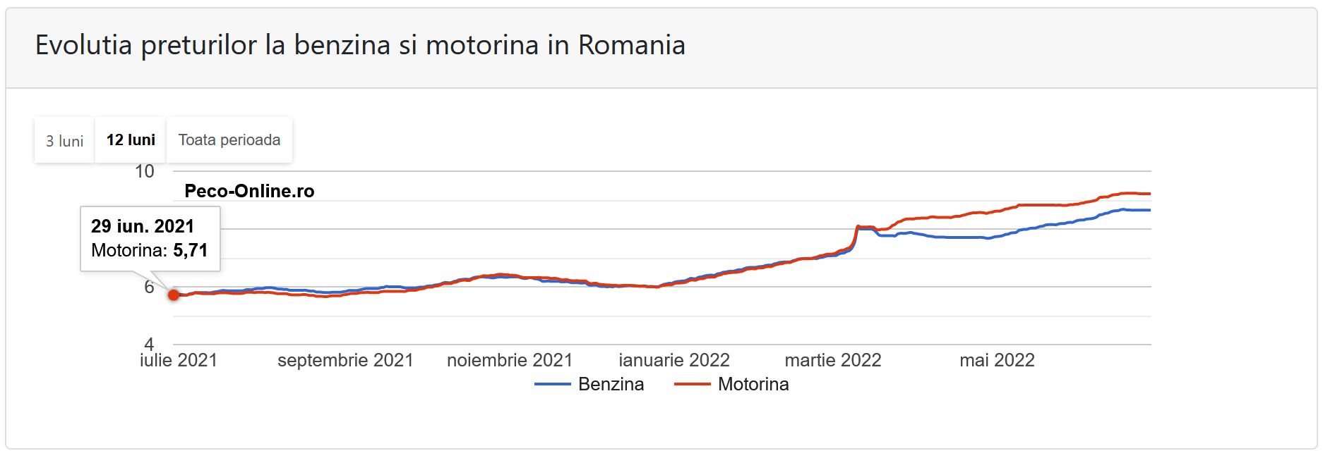 În ultimul an, prețul mediu al unui litru de benzină a crescut cu 2,91 de lei (50,7%), de la 5,74 de lei la 29 iunie 2021 până la 8,65 de lei la data de 25 iunie 2022.