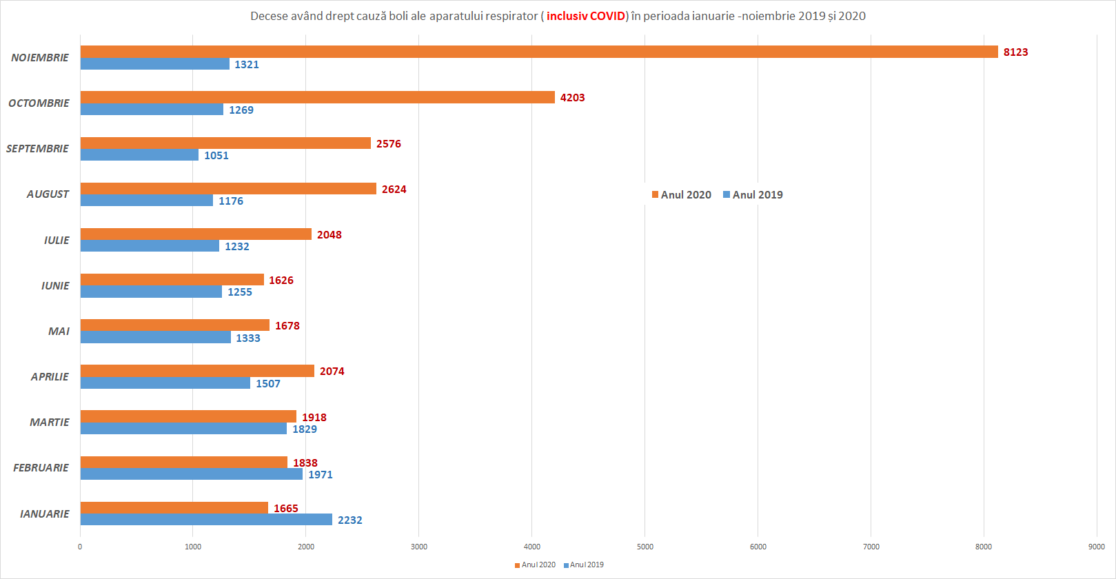 Graficul următor este cel privind numărul total de decese din perioada ianuarie-noiembrie 2020 și respectiv 2019. În total, în primele 11 luni din 2020 au murit cu aproape 25.000 de români mai mulți decât în 2019. Cea mai mare parte a diferenței numărului de decese provine din categoria ”boli ale aparatului respirator”, care include COVID-19.