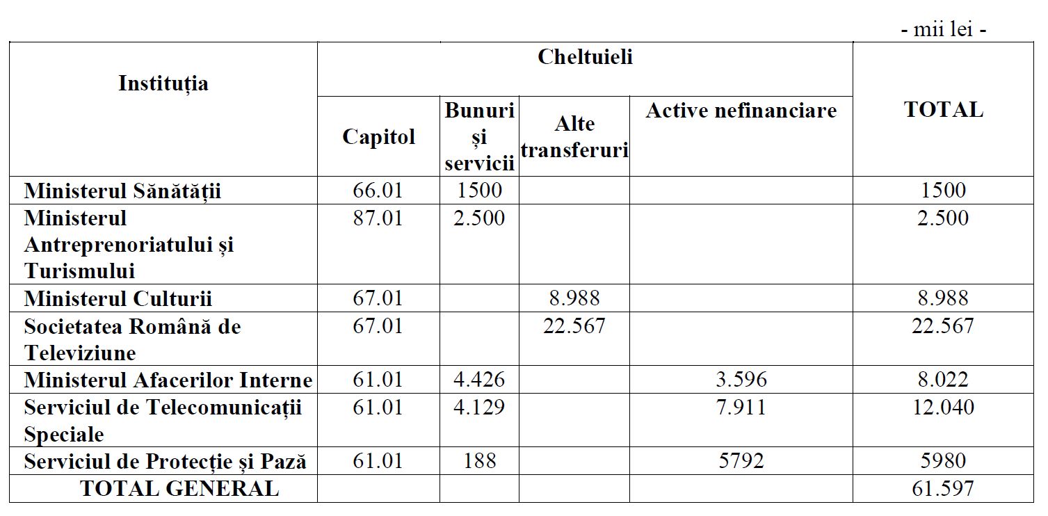 Primul act vizează alocarea sumei de 61,6 milioane de lei din fondul de rezervă pentru instituțiile cu atribuții în organizarea acestui eveniment.