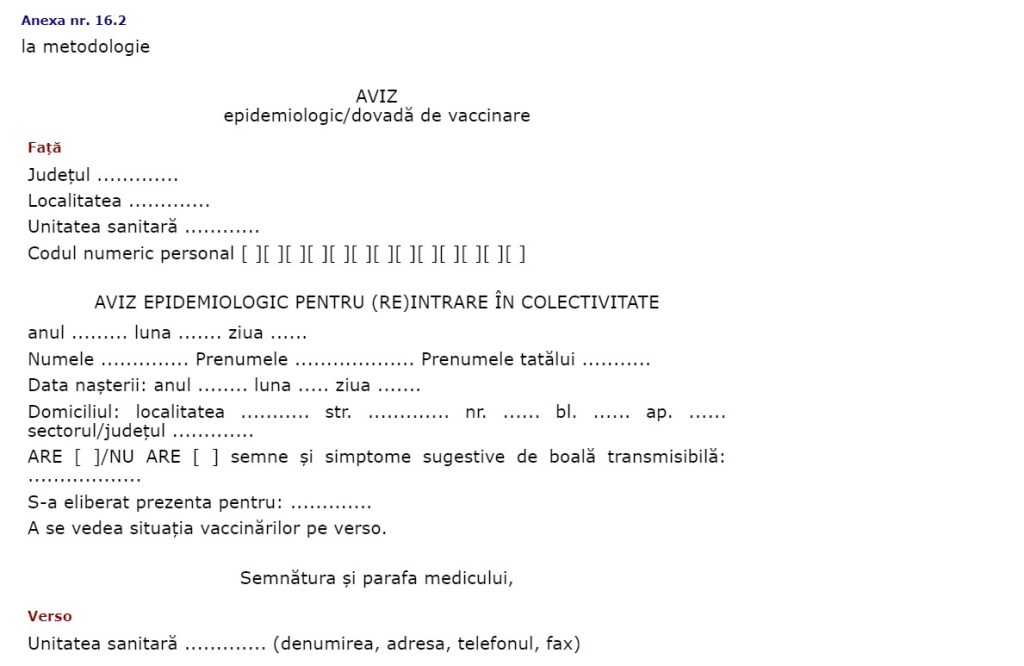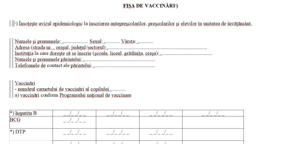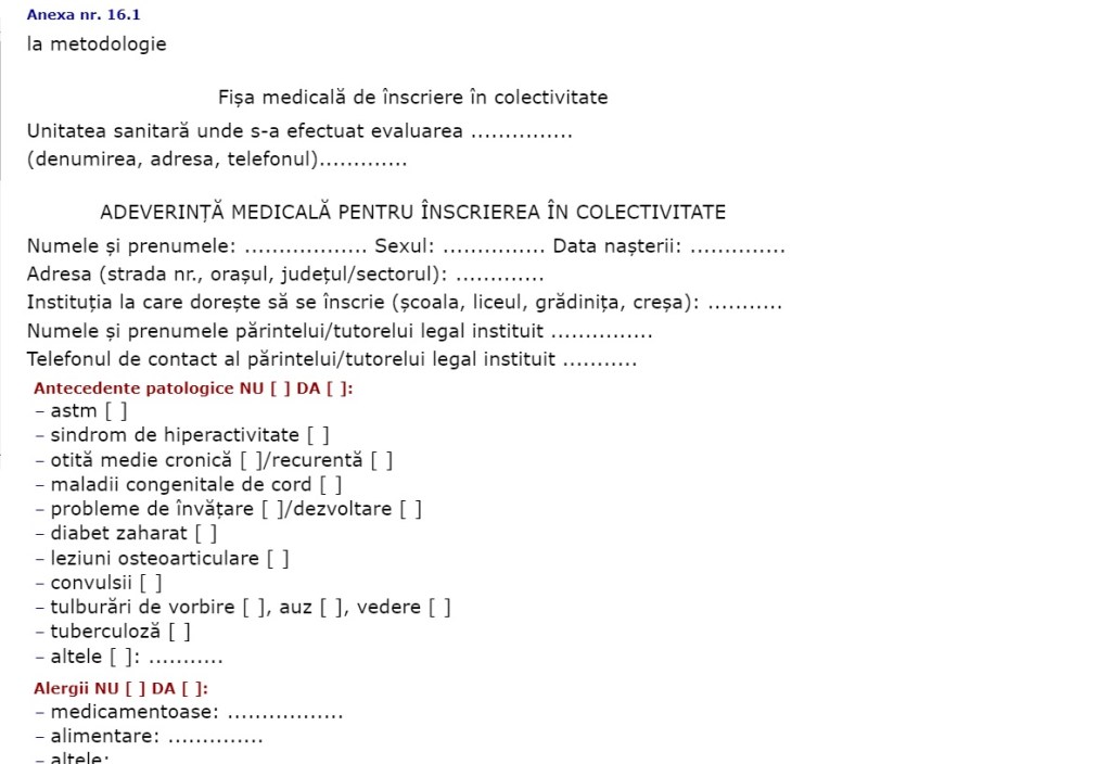 - dacă elevul a frecventat o școală în care nu există cabinet medical școlar: adeverința medicală de înscriere în colectivitate (împreună cu dovada de vaccinare a copilului) – eliberată de medicul de familie.