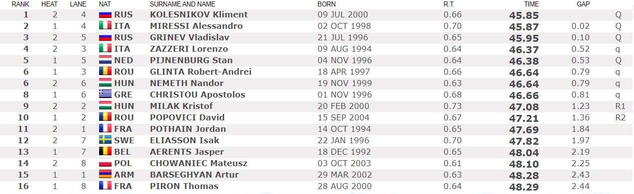 Cel mai bun timp din semifinale a fost obținut de rusul Kliment Kolesnikov: 45.85.