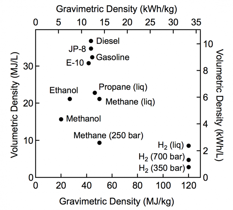 Pe bază de masă, hidrogenul are un conținut energetic superior benzinei și gazului metan: 120 MJ/kg pentru hidrogen față de 44 MJ/kg pentru benzină și 50 MJ/kg pentru gaz metan. Pe bază de volum, însă, situația este inversă; hidrogenul lichid are o densitate de numai 8 MJ/Li, în timp ce benzina are o densitate de 32 MJ/L, iar metanul are 22 MJ/L (Fig. 1).