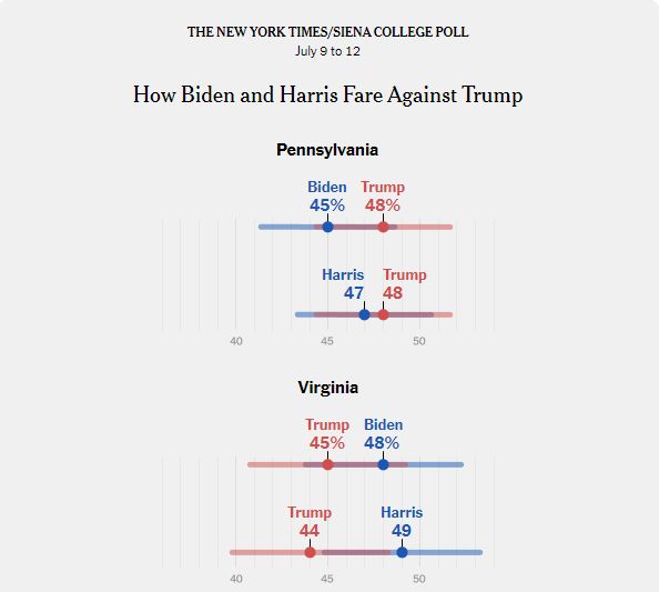 Harris stă mai bine decât Biden în statele cheie Virginia și Pennsylvania. Sursa: New York Times