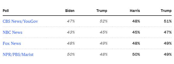 Un sondaj național CBS News/YouGov realizat săptămâna trecută a arătat spre exemplu că Trump îl devansa pe Biden cu cinci puncte în rândul alegătorilor probabili, 52% la 47%, în timp ce Harris era în urma sa cu doar trei puncte, 51% la 48%.