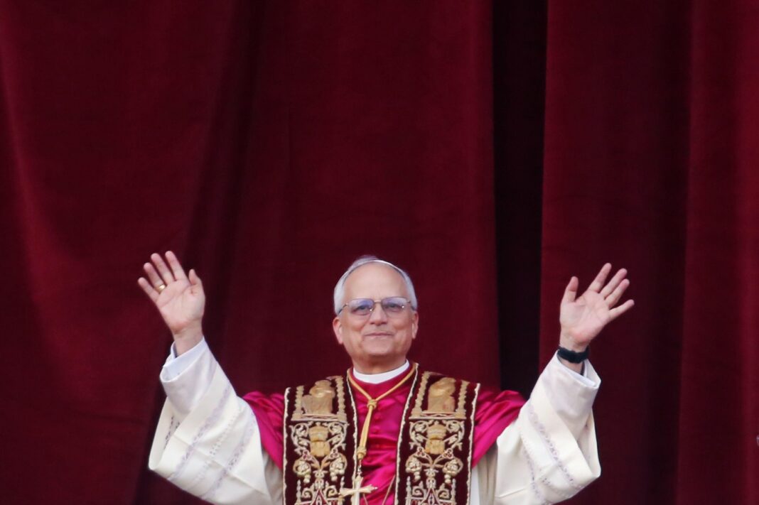 Noul Papă Leon al XIV-lea, fostul cardinal Robert Francis Prevost, în balconul Bazilicii Sfântul Petru din Vatican, 8 mai 2025.