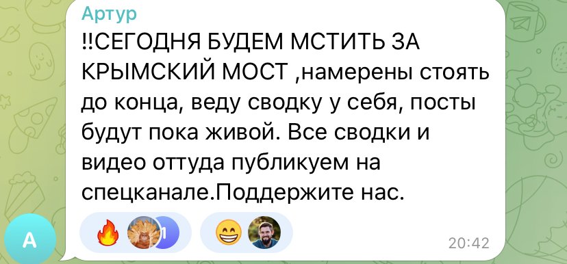 „Astăzi vom răzbuna pentru podul din Crimeea, suntem hotărâți să stăm până la sfârșit, vă voi ține la curent atâta timp cât voi fi viu. Materialele le vom publica pe un canal special. Vă rog, să ne susțineți”, a scris Artur într-un comentariu. Probabil este vorba despre un militar rus.