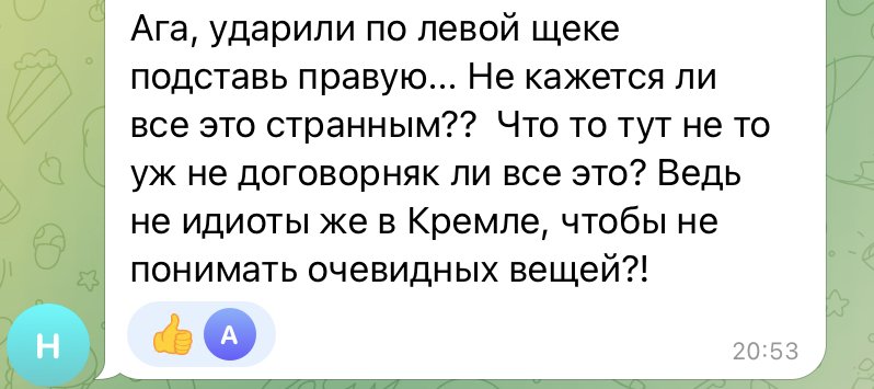 „Aha, au dat o palmă pe obrazul stâng, îl întinzi și pe cel drept… Nu credeți că totul este ciudat? Ceva nu este în regulă aici, nu ar fi vorba despre o înțelegere? Doar nu stau idioții în Kremlin pentru a nu înțelege lucruri evidente?!”, a scris alt utilizator de Telegram.