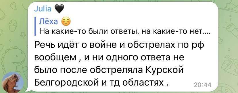 „Este vorba despre un război și atacuri asupra FR (Federația Rusă – n.r.), și nu a fost niciun răspuns după împușcăturile din regiunile Kursk, Belgorod și alte”, scrie Julia care se referă la faptul că armata Kremlinului nu ar fi răspuns adecvat la loviturile pe care Ucraina le-a dat până acum unor unități militare aflate pe teritoriul Rusiei.