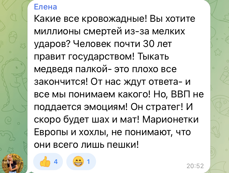 O altă categorii de opinii exprimate pe Telegram este cea care arată susținere și încredere în „victoria Rusiei”. „Noi suntem puternici. Rusia este o putere mondială. Dar rușii – (simbol o inimioară). Noi toți trebuie să fim împreună și să nu avem dubii că vom învinge”, a scris Natalia.