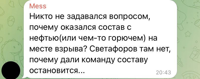 „Nimeni nu și-a pus întrebarea de ce trenul cu petrol (sau un alt combustibil) a nimerit la locul exploziei? Semafoare acolo nu sunt, de ce a fost dată comanda ca acest tren să se oprească…”, a scris un alt utilizator anonim de Telegram.