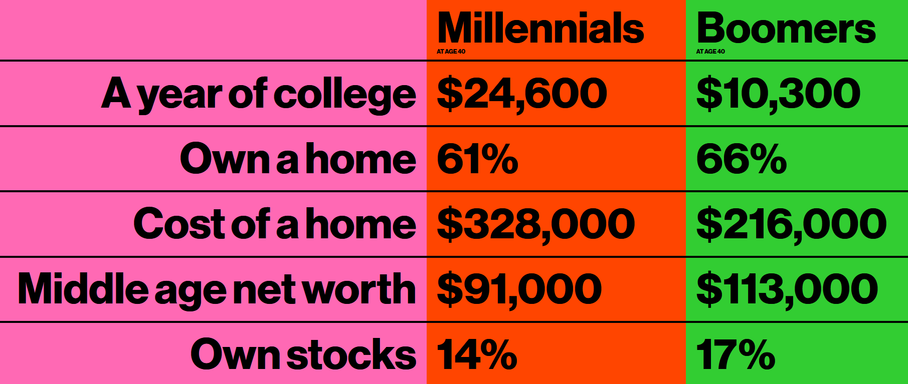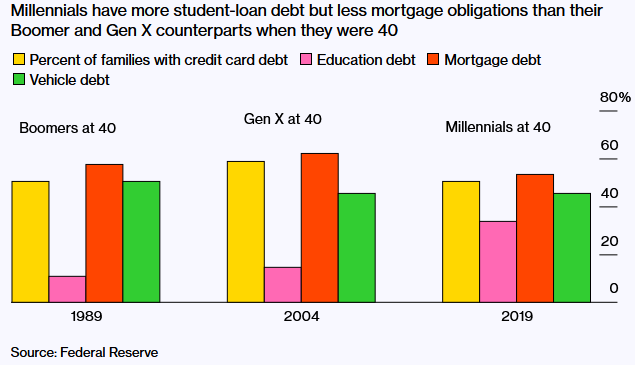 Unele dintre diferențele de avere dintre generații pot fi atribuite datoriilor pe care unii o au după ce aleg să meargă la facultate. Mulți millennials au ales să se împrumute pentru a merge la facultate. De la generație la generație, aceste împrumuturi au crescut. Cei care au facultatea în 1999 au plătit, în medie, 15.604 dolari pe an pentru școlarizare, taxe și cazare. Generațiile de dinaintea lor au plătit aproape 10.300 dolari pe an.