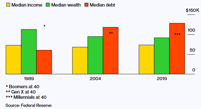 În graficul de mai sus se poate observa cum averile au scăzut de la o generație la alta, în timp ce datoriile au crescut simțitor. Dacă în 1989 averile medii erau de aproximativ 112 mii de dolari, în 2019 averile medii erau de puțin peste 91 de mii de dolari, notează Bloomberg.