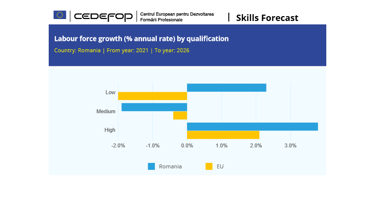 E drept, ocuparea forței de muncă în România va crește cu o rată mai mare decât media UE-27 în perioada următoare, potrivit estimărilor Centrului European pentru Dezvoltarea Formării Profesionale (Cedefop). Astfel, rata de participare pe piața forței de muncă pentru cei de peste 65 de ani va ajunge la 82% (de la 56% în anul 2000).