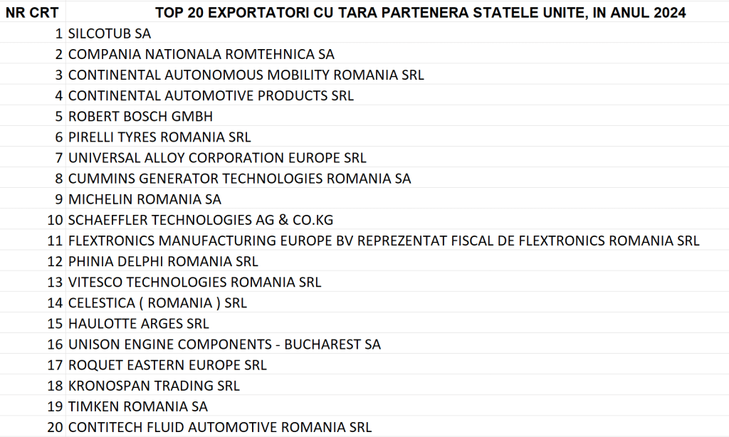 În România, primii care vor încasa lovitura vor fi exportatorii de mărfuri în SUA. HotNews a solicitat oficial de la Institutul Național de Statistică lista primilor 20 de exportatori români pe relația Statele Unite.
