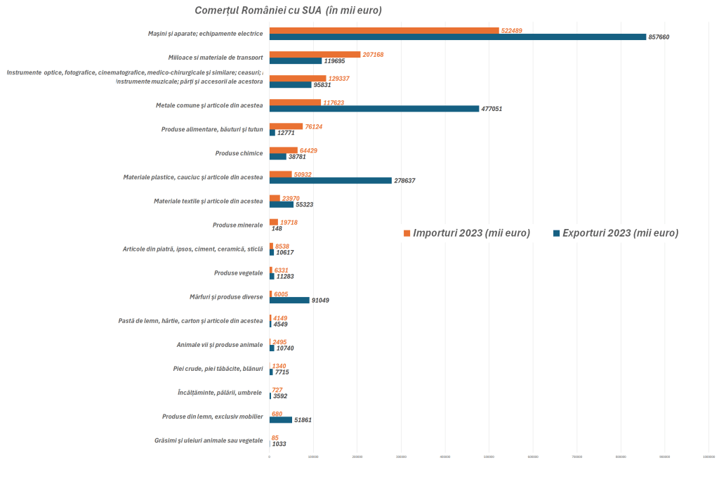 SUA au un deficit comercial în relația cu țara noastră de peste 770 de milioane de euro, potrivit datelor transmise de Institutul Național de Statistică și analizate de HotNews.ro. România a exportat în SUA produse și servicii de peste 2 miliarde de euro și a importat de la americani de 1,3 miliarde de euro.