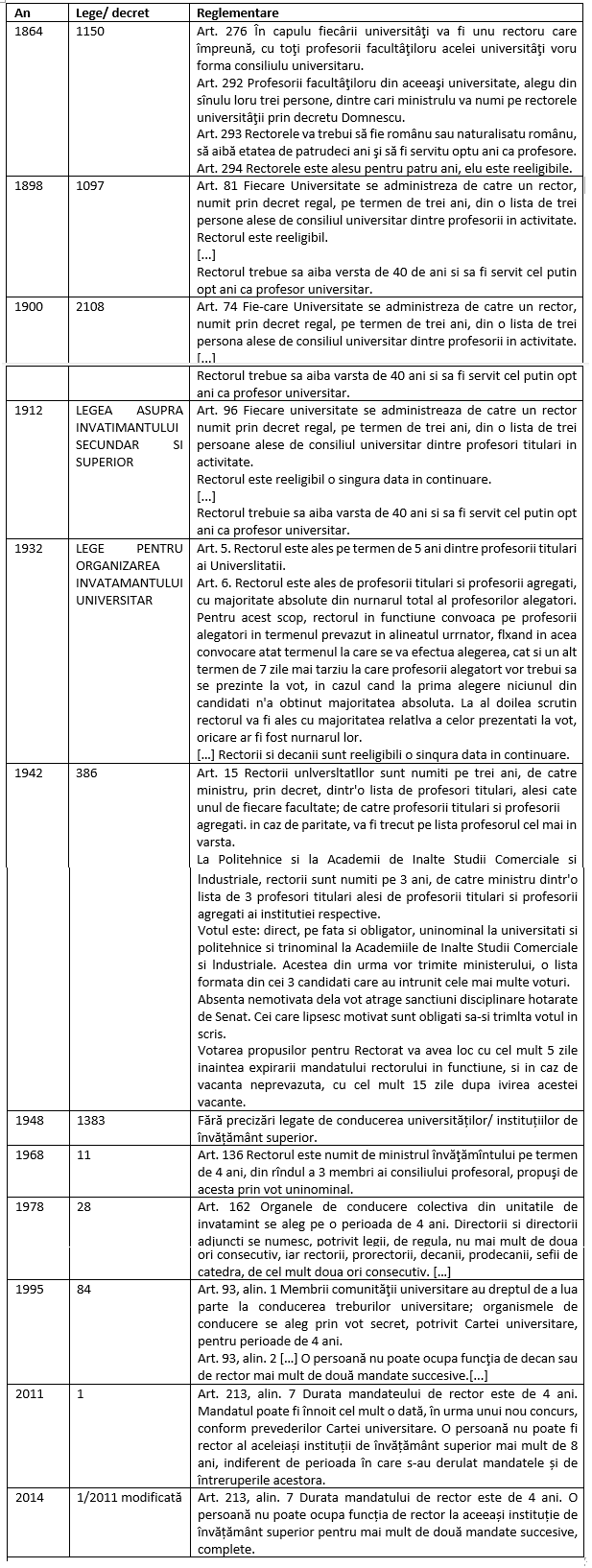Legea din 1864 (implementată, deci, pe vremea lui Cuza) prevedea la art. 294 un mandat pentru rector de 4 ani cu posibilitatea de a fi reales/ renumit (fără limită de mandate).Vreme de peste 35 ani aceasta a fost regula de funcționare.